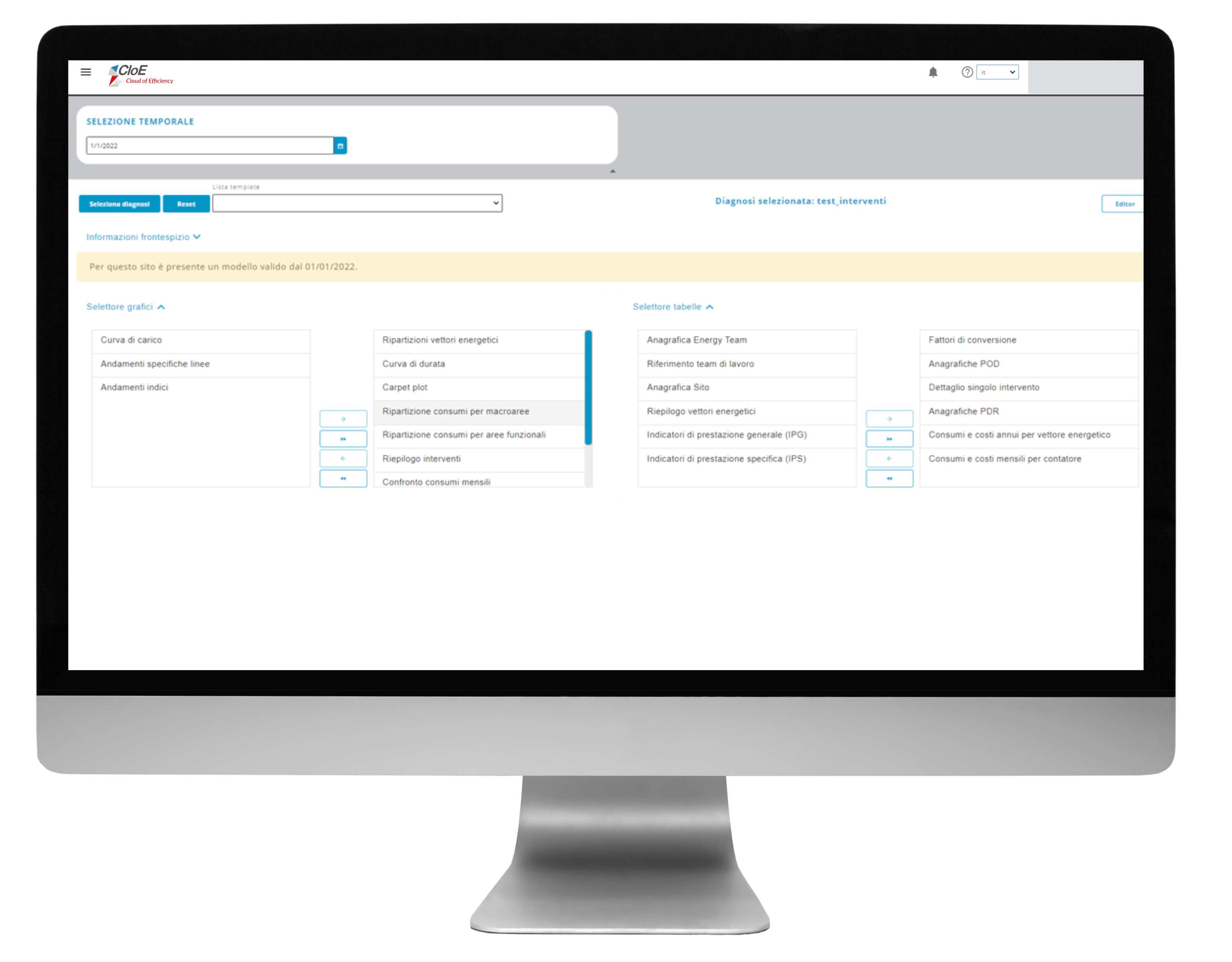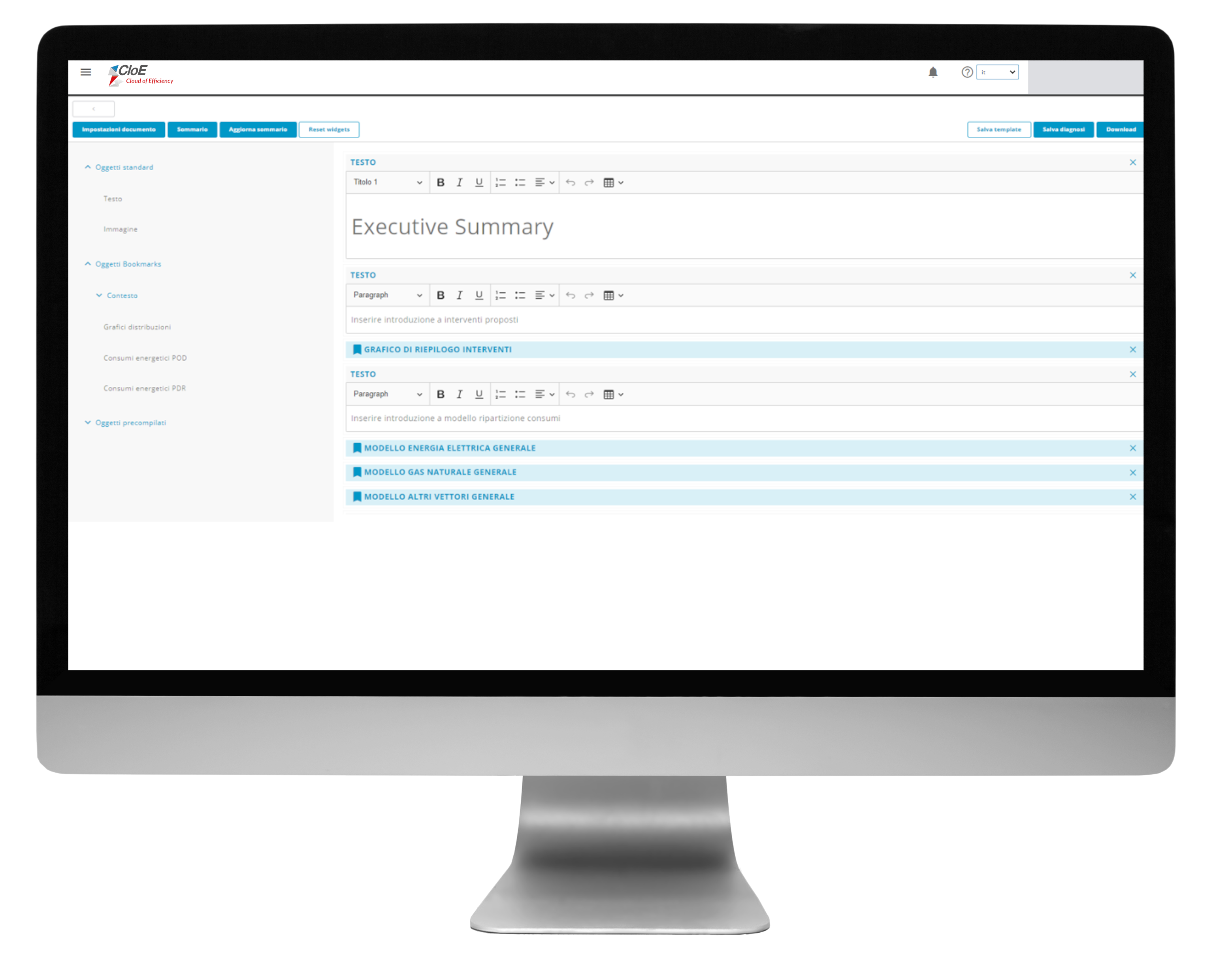 L’utente ha a disposizione un editor che consente di personalizzare la struttura del documento di diagnosi energetica richiesto da Enea, inserendo testi, immagini e/o grafici e tabelle generati da CloE.